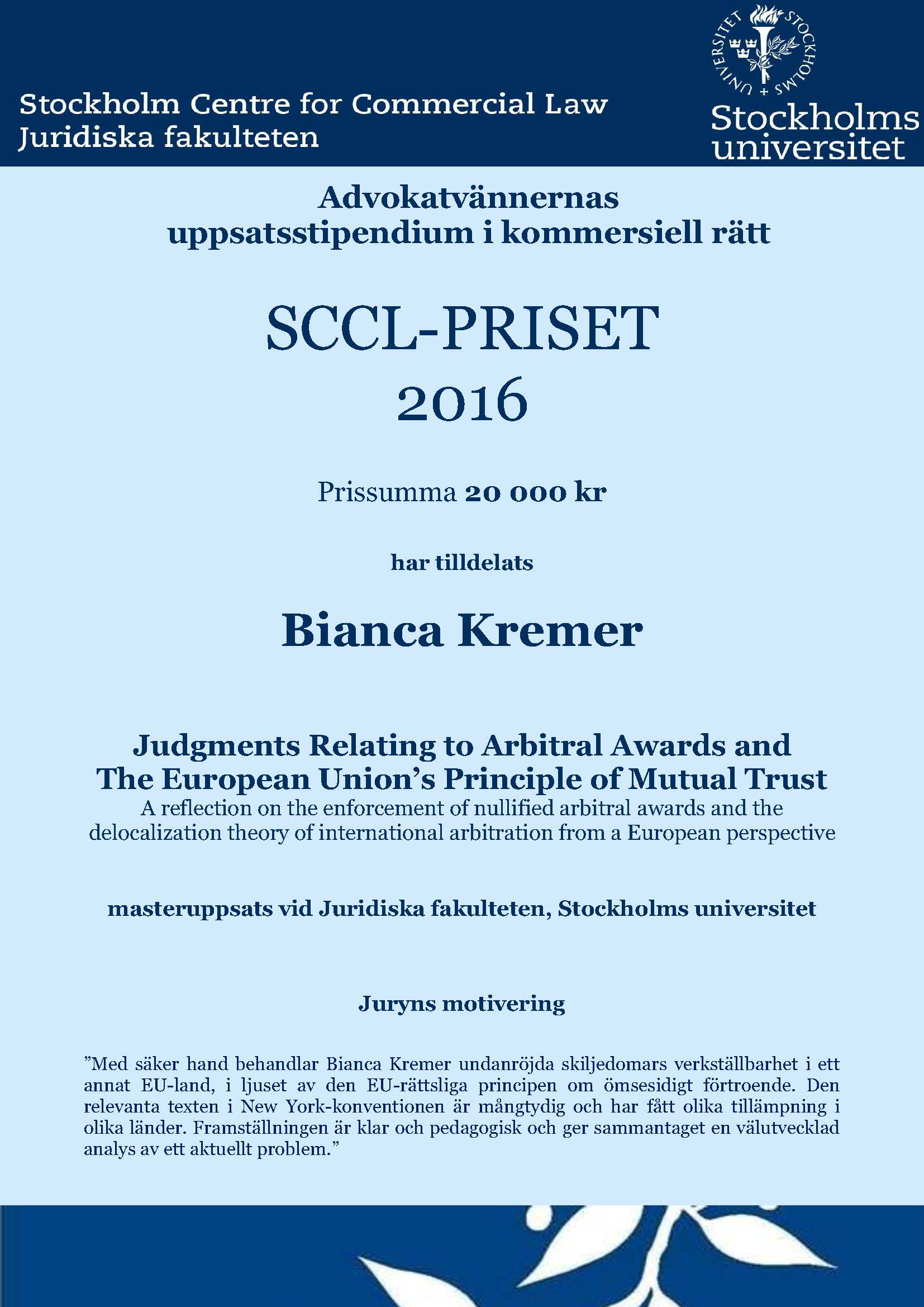 Priset har för år 2016 tilldelats Bianca Kremer för hennes masteruppsats i internationell skiljemannarätt vid juridiska fakulteten, Stockholms universitet. Uppsatsen bär titeln ”Judgments Relating to Arbitral Awards and The European Union’s Principle of Mutual Trust – A reflection on the enforcement of nullified arbitral awards and the delocalization theory of international arbitration from a European perspective”. Handledare för examensarbetet har varit professor Christina Ramberg.